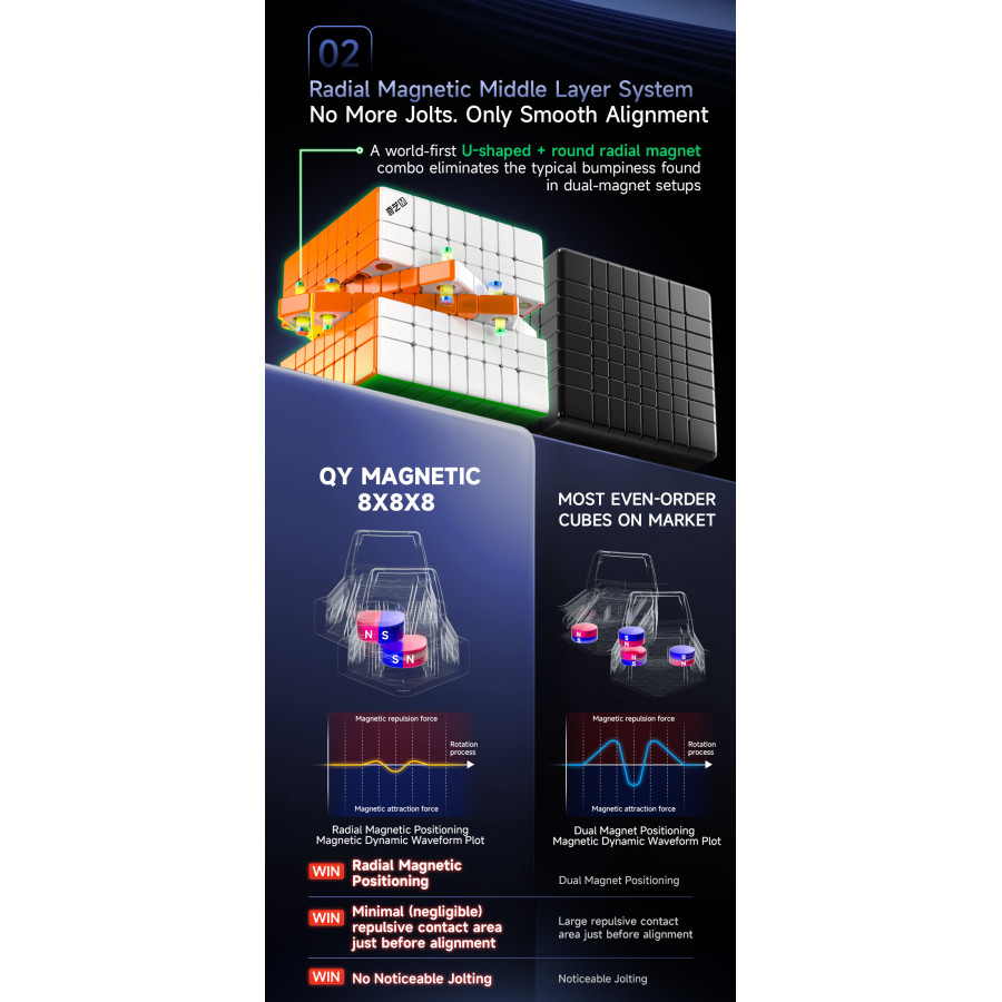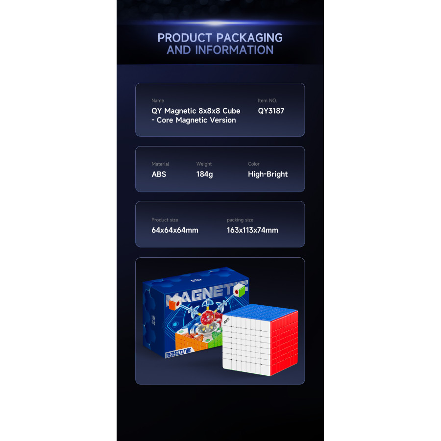 Le Meilong 8x8 est un Rubik’s Cube 8x8 premier prix, c’est un cube assez compact puisque qu'il est un peu plus petit que les autres cubes 8x8.Sa rotation est très bonne et peut s’améliorer beaucoup si elle est ajustée et lubrifiée correctement.C'est une excellente option pour apprendre à résoudre le cube 8x8.