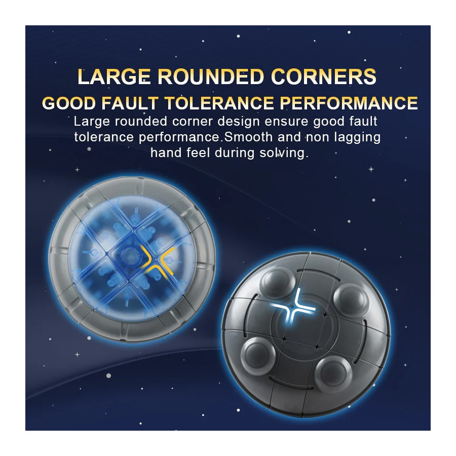 Ce "cube" est sensé représenter une soucoupe volante et on imagine volontiers que se cachent des extraterrestres sous la coupole bleue. Il est conçu comme un 3x3x3 et il faut donc bien connaître le mode de résolution d'un 3x3x3 car il faut savoir trouver la place des pièces en la repérant d'après leur forme. En plus il faut connaître la technique d'orientation des centres de la rangée équatoriale. Bonne qualité de fabrication. Souple, solide et silencieux. Les axes de rotation horizontaux sont un peu difficiles à repérer et les éléments doivent être bien alignés pour pouvoir pivoter. Intéressant à résoudre. On aurait aimé une couleur un peu plus flashy que ce gris
